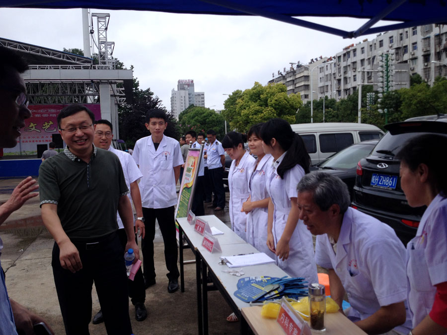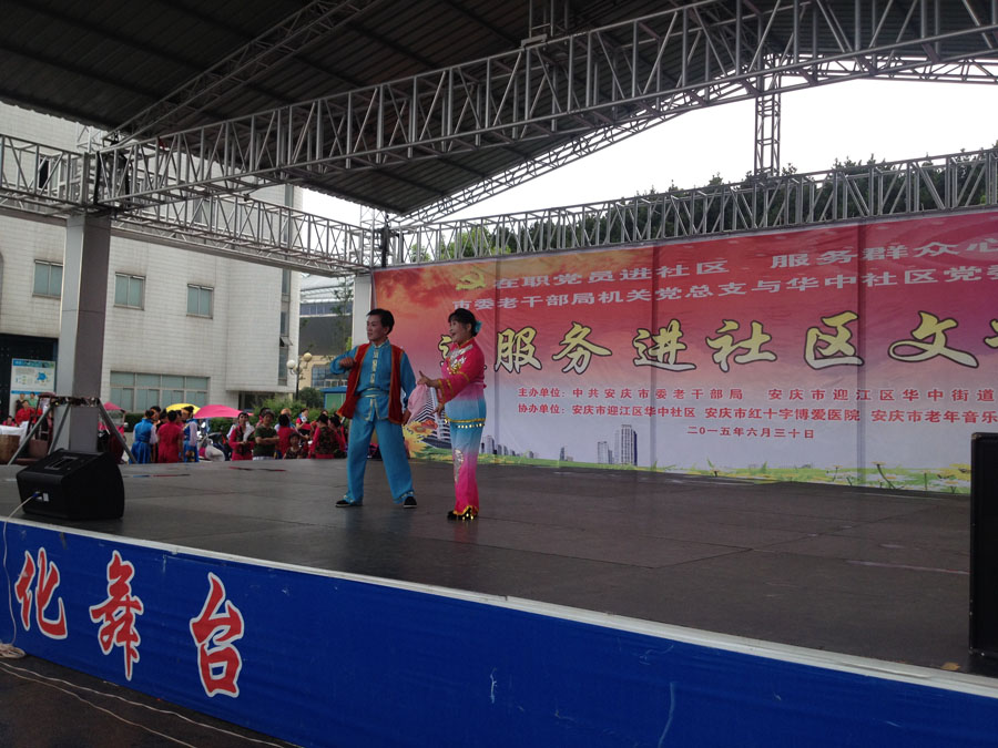 2015年6月30日下午,由中共安庆市委老干部局、安庆市迎江区华中街道办事处主办,安庆市博爱医院、安庆市迎江区华中社区、安庆市中老年音乐舞蹈协会共同承办的“在职党员进社区 服务群众心连心”市委老干部局机关党总支与华中社区党委结对共建《送服务进社区文艺演出》活动在科技广场文化大舞台隆重举办。安庆市博爱医院作为此次活动承办单位,担负着现场医疗应急及惠民体检工作。