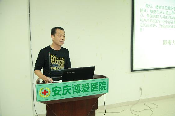 会上,医院院长王品致欢迎辞。王院长代表医院全体员工对行风监督员的到来表示了热烈的欢迎和衷心的感谢。他指出,办“百姓满意的医院”是安庆市博爱医院的高追求和目标。博爱医院院设立“行风监督员”岗位,是为了进一步加强医风医德建设,改善服务态度,提高服务质量,规范诊疗行为,充分发挥舆论监督的重要作用!王院长在致辞中还恳请各位行风监督员切实履行职责,行使手中的权力,强化监督,督促医院人员的自洁自律行为,进一步提高医院的服务水平,促进医患和谐!王院长还表示,在社区的医疗卫生、居民生活保障等方面,博爱医院会充分发扬“人道、博爱、奉献”的精神,会尽力配合各社区的工作。例如,各社区开展慰问孤寡老人、救助贫困家庭等公益活动时,博爱医院也期待参与其中,提供慰问品及为他们提供一些力所能及的帮助,奉献博爱医院的一份爱心。