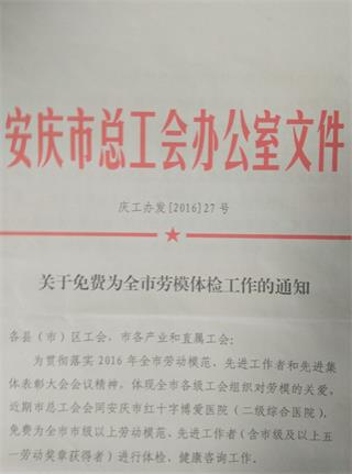 为贯彻落实2016年全市劳动模范、先进工作者和先进集体表彰大会会议精神,体现对劳模的关爱,安庆市总工会近期在全市范围内开展免费为劳动模范、先进工作者(含市级及以上五一劳动奖章获得者)体检、健康咨询工作。安庆市博爱医院本着“人道、博爱、奉献”的精神,主动承担了这次免费体检任务。