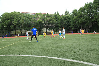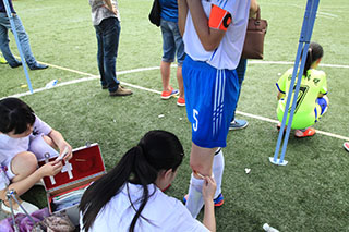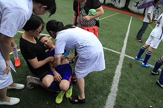 我院派遣了以章晖敏、吴丽丽为成员的医疗小组,携带急救保障设备及药品,随时准备应对比赛活动中可能出现的突发意外情况。比赛过程中,一位球员的膝盖不慎撞伤。护士吴丽丽当即对该队员伤处进行简单处理包扎,防止伤口感染。一名球员的腹部不慎被对方撞到,疼的他眼泪直打转,医生章晖敏马上对其询问并及时处理伤情。