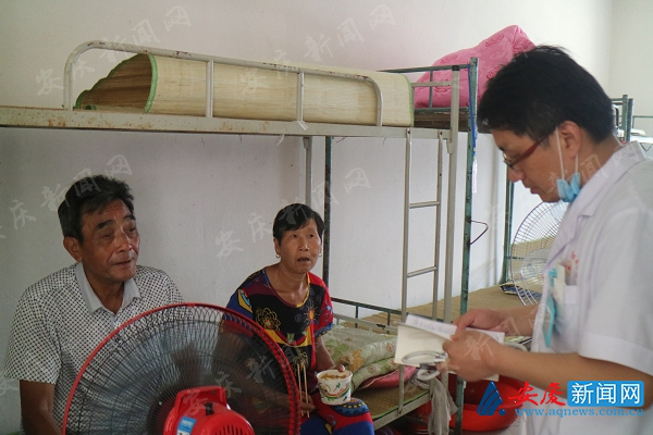 在躺椅上凑合了一夜的谭玉林,一早又打起精神迎接着前来就诊的病人。7月12日上午,在桐城市天城中学安置点,安庆晚报记者见到了安庆市博爱医院志愿者医疗队的队长谭玉林和其他4名队员。作为全省唯一一支志愿者医疗队,也是我市唯一一支长期驻点的医疗队伍,安庆市博爱医院志愿者医疗队的这5名队员,已经在此坚守了10天。