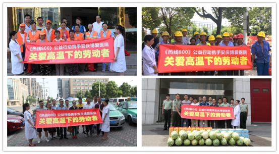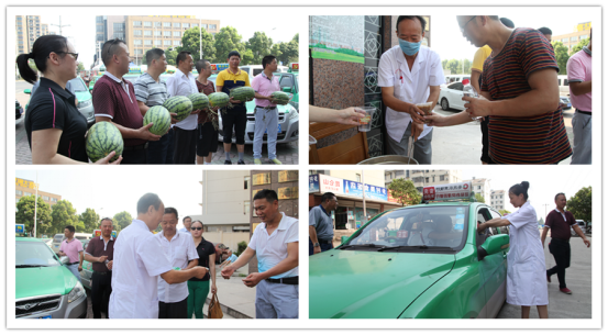 七月流火,酷暑难耐,安庆市博爱医院情牵公益,开展“关爱高温下的劳动者”系列公益活动,相继向天意物业的“环卫工人”、湖心路的“修路工人”、道龙车队“出租车司机”、安庆武警支队“秦潭湖消防中队官兵”送上绿豆汤、西瓜、防暑药品等清凉物资,以沁人心扉的清凉,为劳动者带去了浓浓关爱。