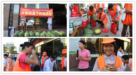 7月30日上午9:00,安庆市博爱医院迎来了20多位刚刚上完早班的“环卫工人”。“王大妈,我们是安庆市博爱医院的爱心小分队,高温劳动的你们辛苦了!这里有冰镇绿豆汤,您赶紧喝点,解解暑。”护士递上了一杯绿豆汤,贴心地说道。53岁的环卫工人王大妈是迎江区街道班的环卫工人,一边喝着冰镇的绿豆汤,一手拿着大西瓜,开心地笑了。