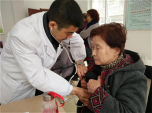 ▲图为骨科医生为老人测心率
