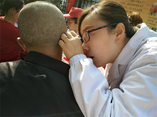 ▲图为耳鼻喉科鲁帆医生帮居民检查身体