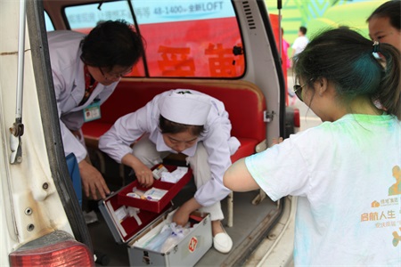 ▲安庆博爱医院医护人员为受伤的队员处理伤口