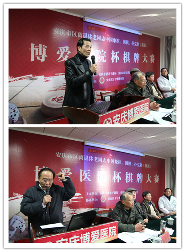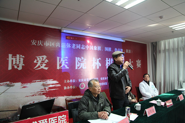 12月19日,“博爱医院杯”安庆市城区离退休老同志中国象棋、围棋、扑克牌比赛在安庆博爱医院三楼多功能厅隆重开幕,安庆市委老干部局冯副局长、安庆市老干部棋艺协会宛会长、安庆博爱医院潮副院长出席开幕式。